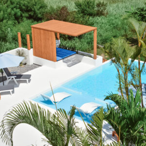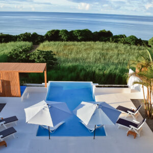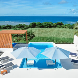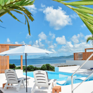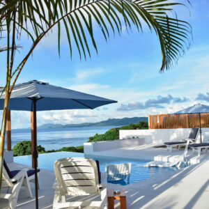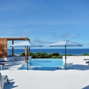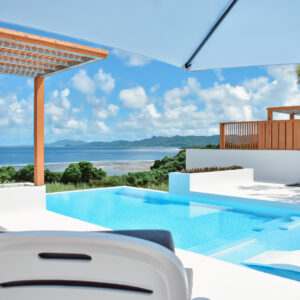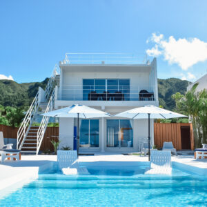 真っ青な空、真っ青な水平線につながる真っ青なプールに白い雲や濃緑のヤシの木が映り込む。完全プライベートのインフィニティプールは当ヴィラのアイコニックな存在です。プールは段差とパラソル付きなのでで乳幼児のお子様にも安心です。石垣島でコバルト・ブルーの海を見渡せるインフィニティプールがあるのはオーシャンビュー石垣だけ。亜熱帯パラダイスをご堪能ください。