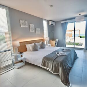 施設 | リビング、ダイニング、キッチン、寝室x3、トイレx2、バスルーム、吹き抜け玄関ホール、WiFi、無料専用駐車場(二台分)、庭、テラス、プライベート屋外インフィニティプール、屋外シャワー、専用ビーチアクセス、ダイニングバルコニー、屋上テラス、オーシャンビュー、マウンテンビュー |