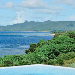 プールサイドのサンチェアから見えるのはサンゴ礁、ヤシの木などの熱帯植物、そして天然記念物セマルハコガメなど希少な野生生物。